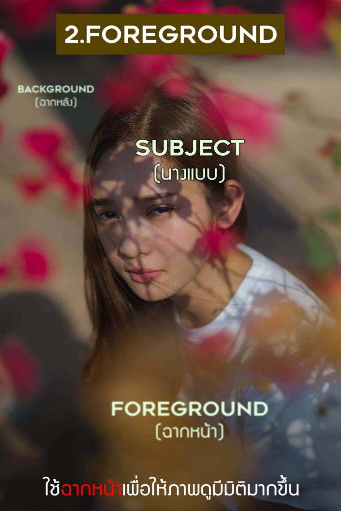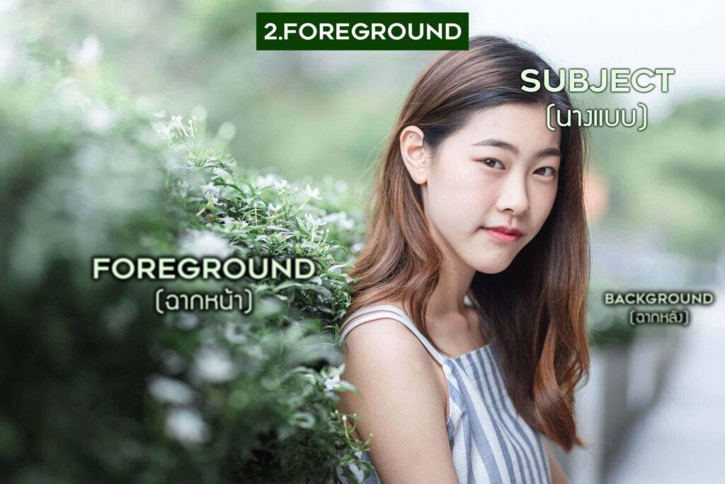 คือการเพิ่มฉากหน้าเพื่อให้ภาพดูมีมิติ เท่ากับว่าภาพที่เราถ่ายจะมี ฉากหน้า ตัวแบบ และฉากหลัง พอภาพมีมิติก็จะทำให้ตัวแบบจะเด่นมากกว่าเดิม
