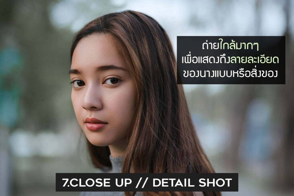 คือการถ่ายใกล้ๆ subject เพื่อแสดงให้เห็นถึงรายละเอียด เช่นถ่ายคนเพื่อโชว์การแต่งหน้า หรือถ่ายสิ่งของเพื่อโชว์สินค้าที่กำลังขาย