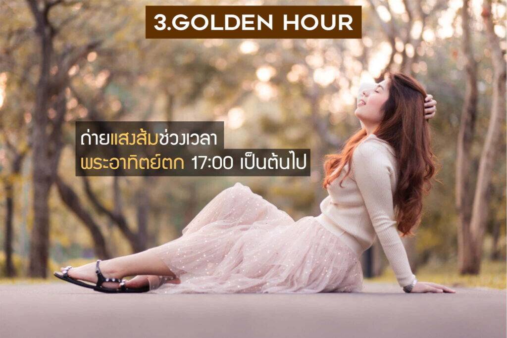 คือการเลือกถ่ายภาพช่วงแสงส้ม ก็คือตอนพระอาทิตย์ตกดิน ช่วงเวลาหลัง 17:00 จะทำให้ภาพดูหรู อบอุ่น และสะดุดตา เพราะความส้มของแสงอาทิตย์